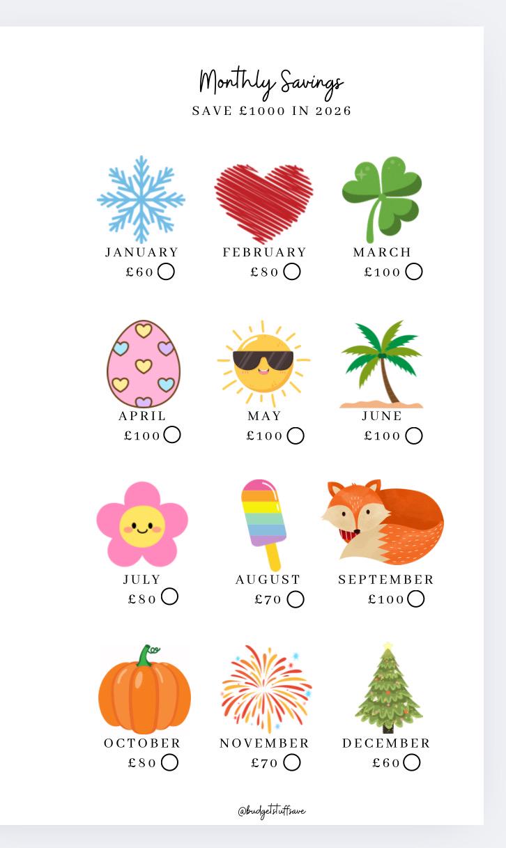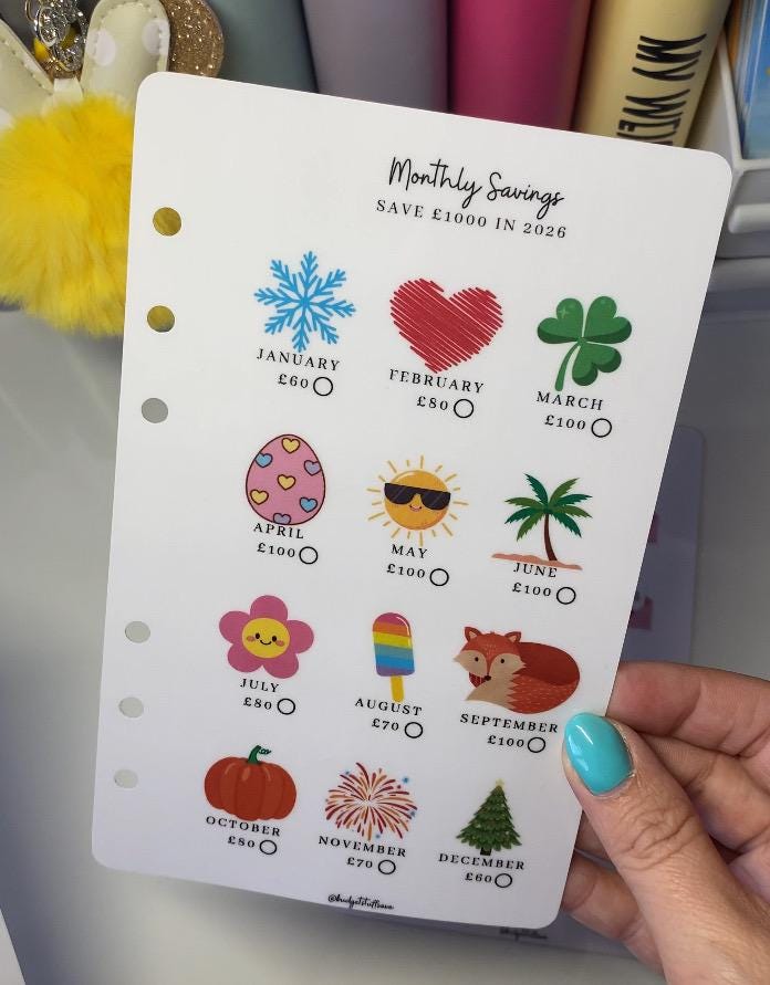 This tracker fits in an A6 binder and is hole punched. Great for using alongside a money tin.