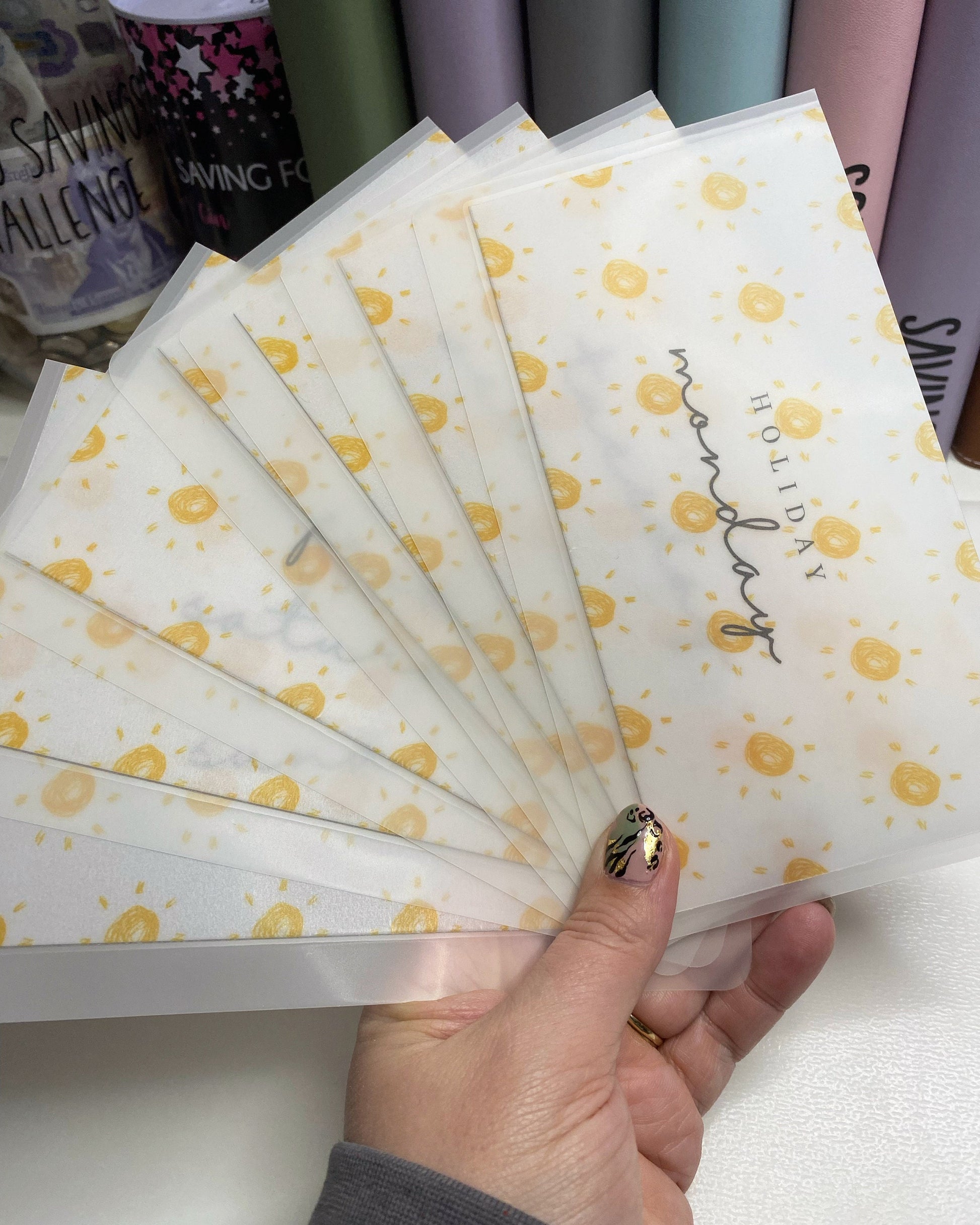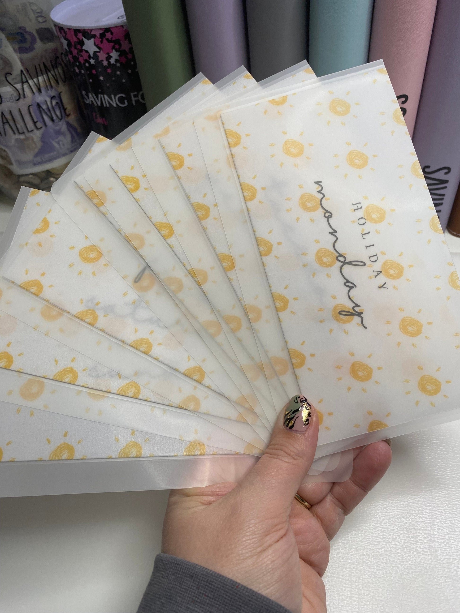 Introducing our stunning vellum wallets, perfectly designed to fit inside your A6 binder and assist you on your cash stuffing journey!Set of 7 wallets. Monday- Sunday. Each one is crafted with care to enhance your organization and keep your cash stuffing journey stylish and efficient. Select your preferred design from the options available and elevate your binder organization today! ✨💼🌟