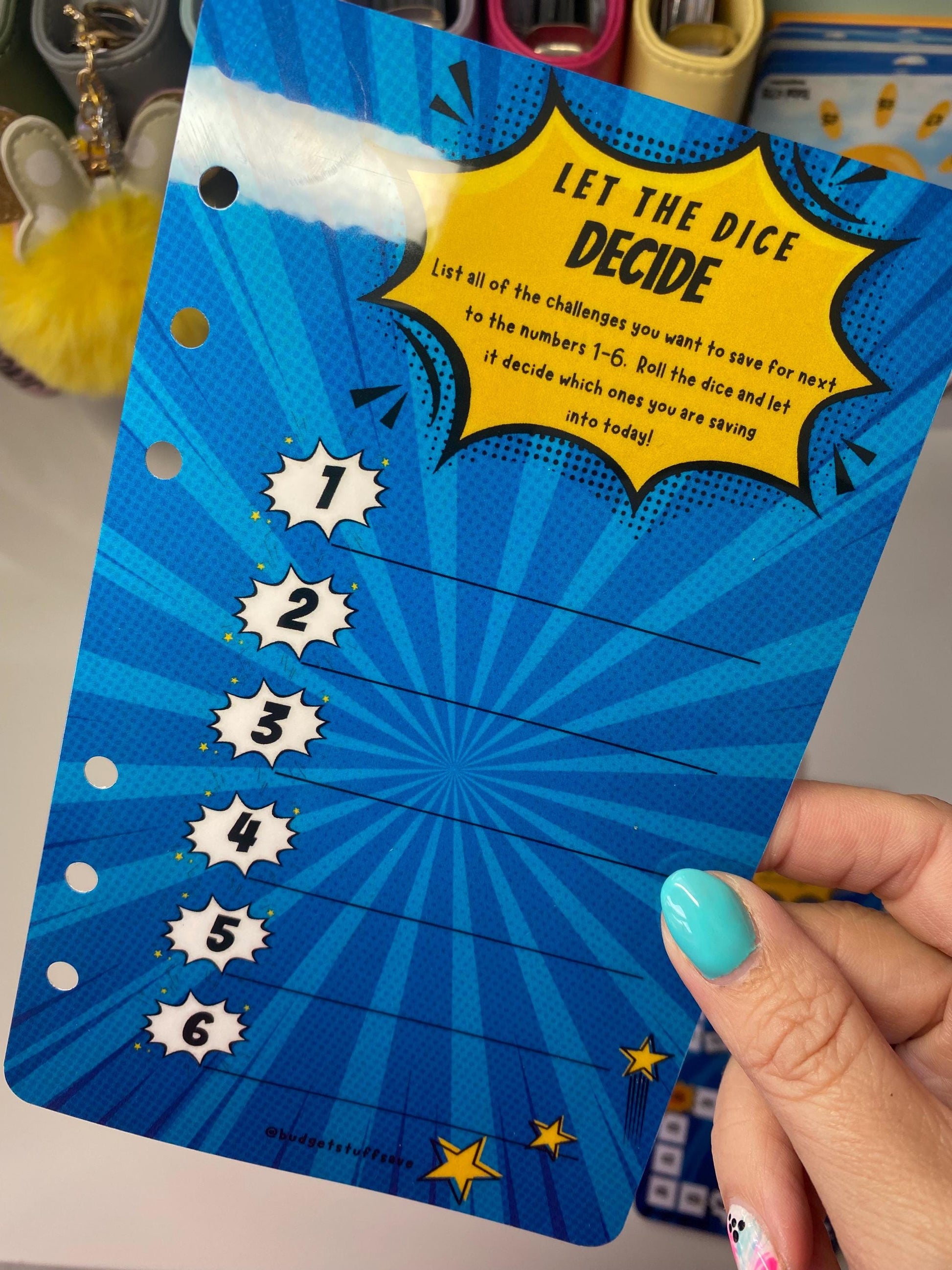 Introducing our Let the Dice Decide Dashboard for your A6 binder. List 6 challenges that you are currently working on and throw the dice to see which one you will save towards today. or maybe you have a little more money and want to pick 3 or 4. roll the dice multiple times to see which challenges are getting your money today!